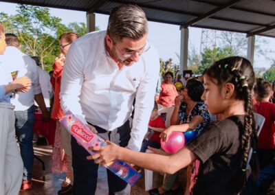 Este jueves, el festejo llegó a la localidad de Praxedis Guerrero Km. 18, contando también con la participación de habitantes de La Esperanza Km. 12, Linda Vista, Países Bajos Km. 8, Aire Libre Km. 15, Villa Mar, Chacoaco, Higo de la Esperanza, Miramar, Benito Juárez y Playa Emiliano Zapata, donde las y los pequeños disfrutaron de una tarde llena de sonrisas, regalos y sana convivencia.